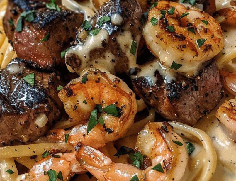 There is something inherently indulgent about the combination of perfectly seared steak and succulent garlic shrimp. When you nestle these two titans of the culinary world into a bed of silky, garlic-infused cream sauce and al dente fettuccine, you don’t just have a meal—you have an experience.