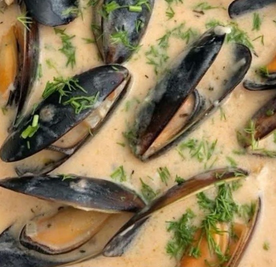 - Ladle into bowls, garnish with parsley and a few whole mussels on top.