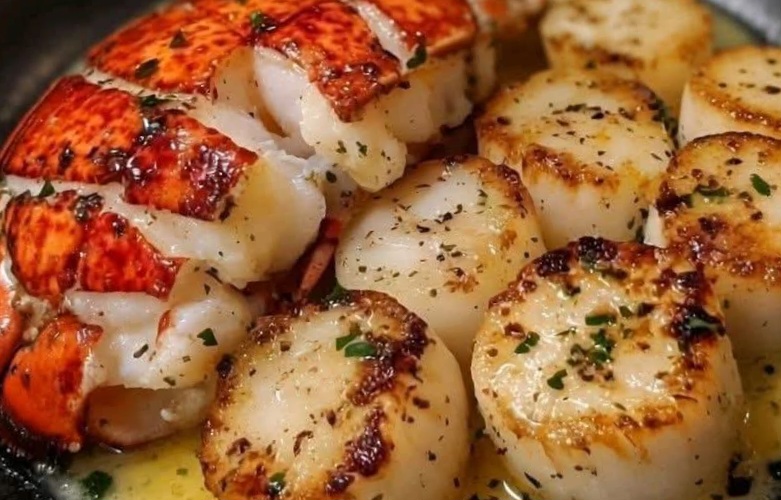 For Lobster Tails & Garlic Butter:20 oz (2) lobster tails1/2 cup butter3 tbsp olive oil2 heads garlic1/2 tsp salt1 onionFresh parsley (for topping)For Scallops & Lemon Orzo:8 scallops2 tbsp garlic butter1 cup orzo1 cup seafood stock1/2 cup white wine4 tbsp Parmesan cheese4 tbsp lemon juiceSalt & pepper (to taste)Fresh parsley (for topping)Lemon wedges (for serving)Instructions :Prepare the Garlic and Onion:Preheat the oven to 400°F. Trim 1/2 inch off the top of each garlic head to expose the cloves, and remove loose papery skins.Drizzle each head with 1 tbsp olive oil, wrap in foil, and place on a baking sheet.Cut the onion into wedges, keeping the base intact to hold it together. Wrap it in foil with a drizzle of olive oil and add it to the baking sheet.Roast for 40-60 minutes, until the garlic is soft and golden, and the onion is tender and translucent.Make the Garlic Butter:Let the butter soften at room temperature while the garlic and onion roast.Squeeze the roasted garlic cloves out of their skins and mash into the softened butter with salt. Mix until smooth and well combined.Cook the Scallops:Melt 2 tbsp of the prepared garlic butter in a skillet over medium heat.Add the scallops, ensuring they are evenly spaced and not crowded. Sear for 1-2 minutes per side until golden and cooked through. Remove and set aside.Cook the Orzo:Deglaze the skillet with white wine, scraping up browned bits for flavor.Let the wine reduce slightly, then add the orzo and seafood stock. Simmer for 9 minutes, or until the orzo is al dente.Prepare the Lobster Tails:Use kitchen scissors to split the top of each lobster shell. Gently lift the meat to rest on top of the shell.Place the tails on a baking sheet and bake for 10-12 minutes, or until the shells turn red and the meat is opaque. Avoid overcooking to prevent toughness.Finish the Orzo:Stir lemon juice into the cooked orzo, then fold in the scallops, Parmesan, and parsley. Season with salt and pepper to taste. Remove from heat.Serve:Plate the lobster tails over a bed of lemon orzo and scallops.Garnish with roasted onion, melted garlic butter, fresh parsley, and lemon wedges for a finishing touch.Tips for SuccessFresh Ingredients: Opt for fresh seafood for the best flavor and texture. Thaw frozen options thoroughly and pat them dry to ensure a proper sear.Precise Cooking: Use medium to medium-high heat for scallops, ensuring a golden crust without overcooking. Cook lobster until the meat is opaque but still tender.VariationsCitrus Twist: Add zest from lemon or lime to the garlic butter for extra brightness, or drizzle fresh lemon juice over the dish before serving.Herb-Infused Butter: Experiment with herbs like thyme, dill, or tarragon for a new flavor profile. Add a pinch of red pepper flakes or smoked paprika for subtle heat or smokiness.Enjoy!