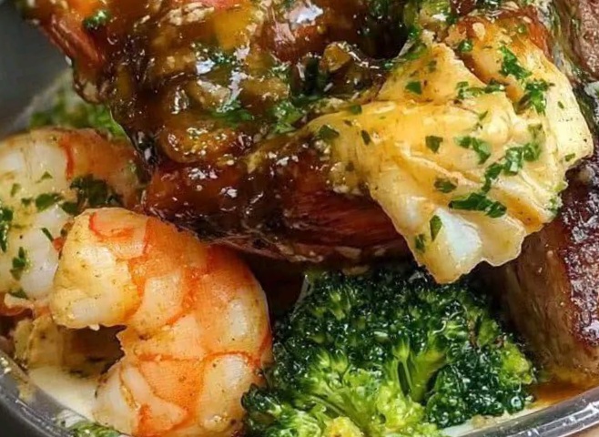 6. Assemble in a clear takeout cup: layer creamy sauce at the bottom, add lamb chops, stack shrimp and crab legs, then tuck broccoli florets along the sides. Drizzle extra sauce over the top.